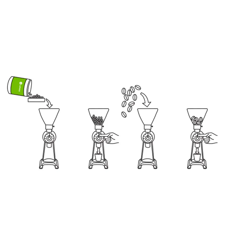 Cleans grinder burrs and casings to improve grinder performance and extend life of grinder burrs.